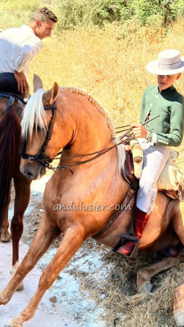 As no arena is available, he has mainly been ridden out in the countryside, where he proves to be very safe and experienced including in traffic, at romerías and ferias. His groundwork has been developed in a playful way, and he already knows some Spanish-style exercises such as the Spanish walk, sitting, and basic in-hand work. In the arena, he behaves well and remains cooperative at all times. Capricho is very social with other horses and spent most of his life living outdoors in the field. He has only recently been stabled again, which is why he is currently a bit on the lighter side, but he is now back in regular work. His owner is approximately 1.82 m tall, which serves as a useful reference. The maimn reason for sale is that a bigger horse is needed.